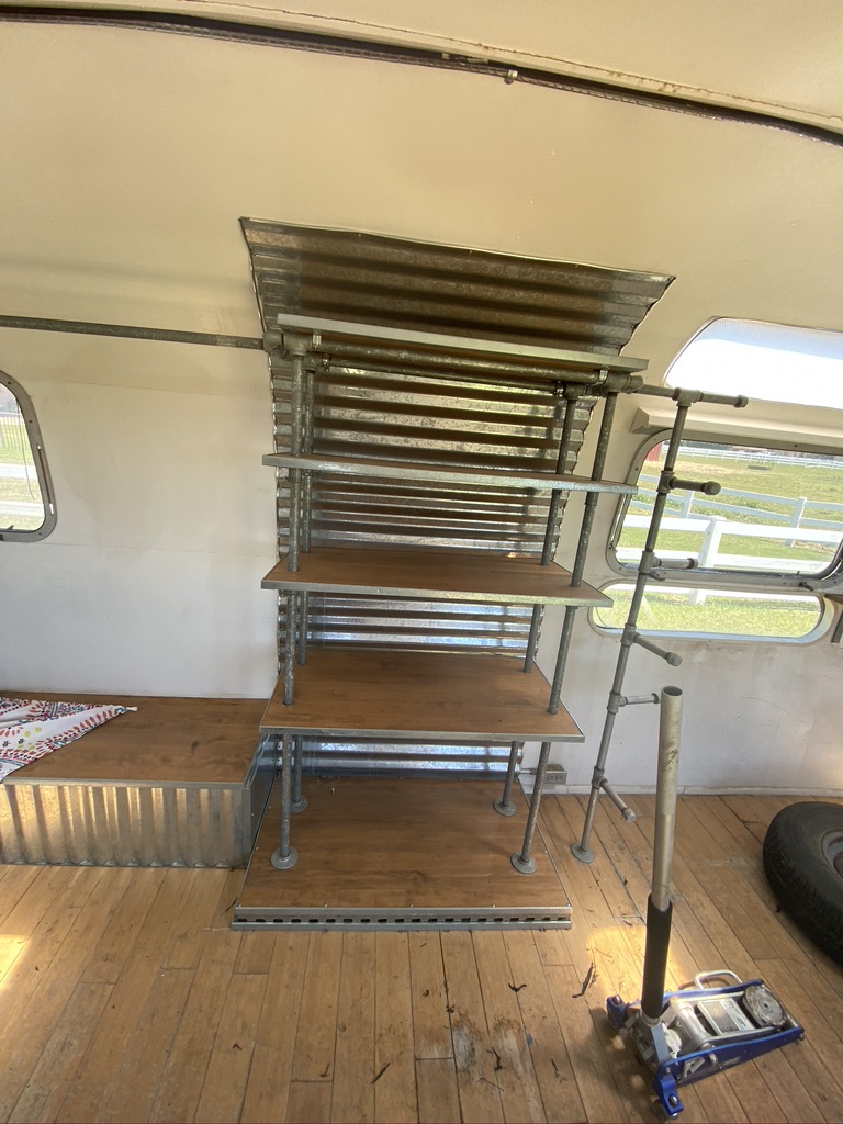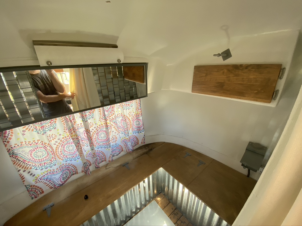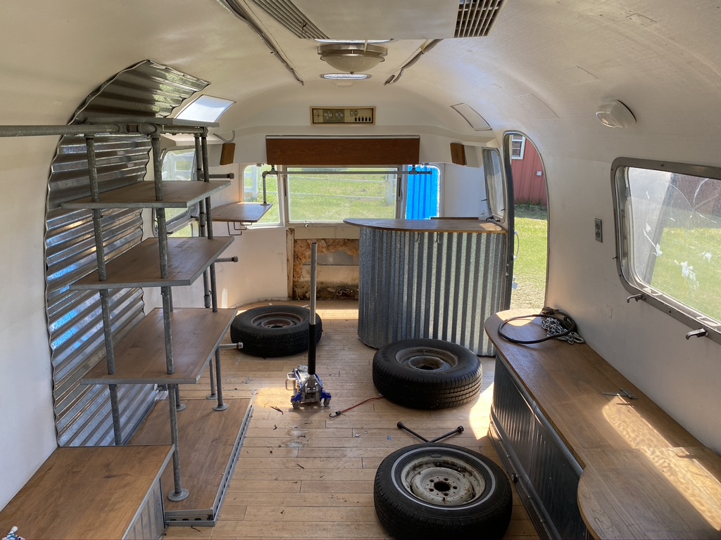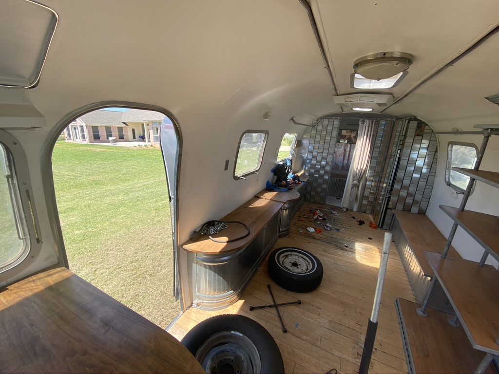 A quick walk around the outside reveals 4 broken windows (yikes! Those guys are expensive!), rust on the A frame and in the rear bumper compartment, numerous dents, a mangled panel or two in the rear road side cap, and tires long past their prime. Inside are the remnants of a clothing boutique with original AC unit, a mini-fridge, changing room, and racks for clothes. It doesn’t leave much for reuse, but we were planning on building from the ground up and making Aurora completely our own.